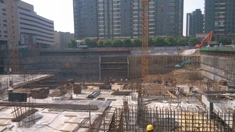 本工程位于北人字路與龍王廟街交口的東北角。是在原北國商城西側進行擴建工程,地上10層、地下4層、采用筏板基礎、框架結構。工程±0.000為72.500m,基底標高為-19.900m。現(xiàn)有地面標高為-0.400m。基坑實際開挖深度由現(xiàn)有地面算起為19.50m(南側、西側、北側)、12.00m(東側:原北國商城)。整個基坑周長約400.00m。